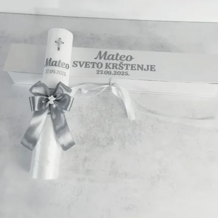 - KRSNA SVIJEĆA sa imenom, datumom krštenja, simbolom križa i ukrasnim vrpcama