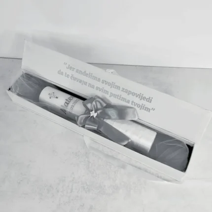 - KUTIJA ZA SET – s imenom, datumom krštenja, natpisom SVETO KRŠTENJE, satenska vrpca i anđeo