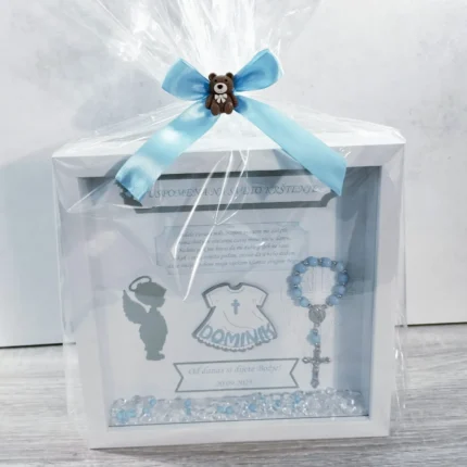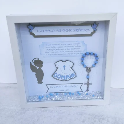 Poklonite prekrasni personalizirani duboki okvir i čestitku kao uspomenu na sveto krštenje. Savršen poklon koji će trajno podsjećati na jedan od najposebnijih dana u životu djeteta.