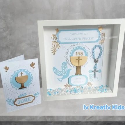 Poklonite prekrasni personalizirani duboki okvir sa usklađenom čestitkom kao uspomenu na prvu svetu pričest. Savršen poklon koji će biti trajna uspomena.