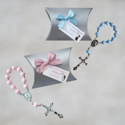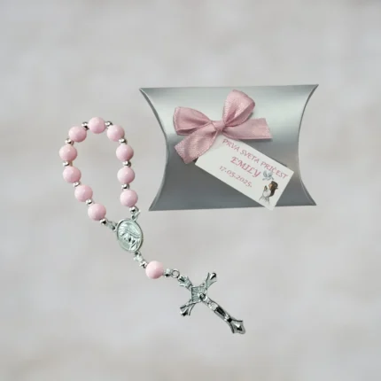 Detalji proizvoda: • Materijal: Akrilne perle, karton, metal, saten i celofan • Dimenzije zahvalnice: cca 9×7 cm • Personalizacija: Ime djeteta i datum. DODACI: Mogućnost personalizacije krunice sa imenom – dodatno se naplaćuje 0,30 EUR po komadu. Rok isporuke: Redovan rok isporuke do 10 radnih dana, mogućnost brze isporuke po dogovoru.