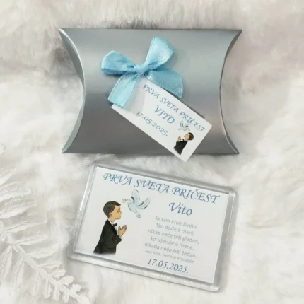 Zahvalnica dolazi u obliku magneta koji možete staviti na hladnjak ili bilo koju metalnu površinu – savršen način da svakodnevno podsjeća na dan kada je dijete primilo sakrament prve svete pričesti.