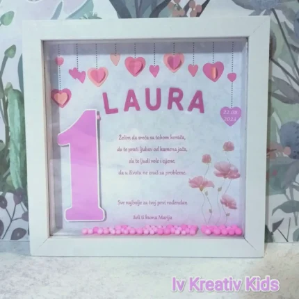 Poklonite prekrasni personalizirani duboki okvir kao uspomenu na prvi rođendan. Savršen poklon koji će postati prelijepa uspomena.
