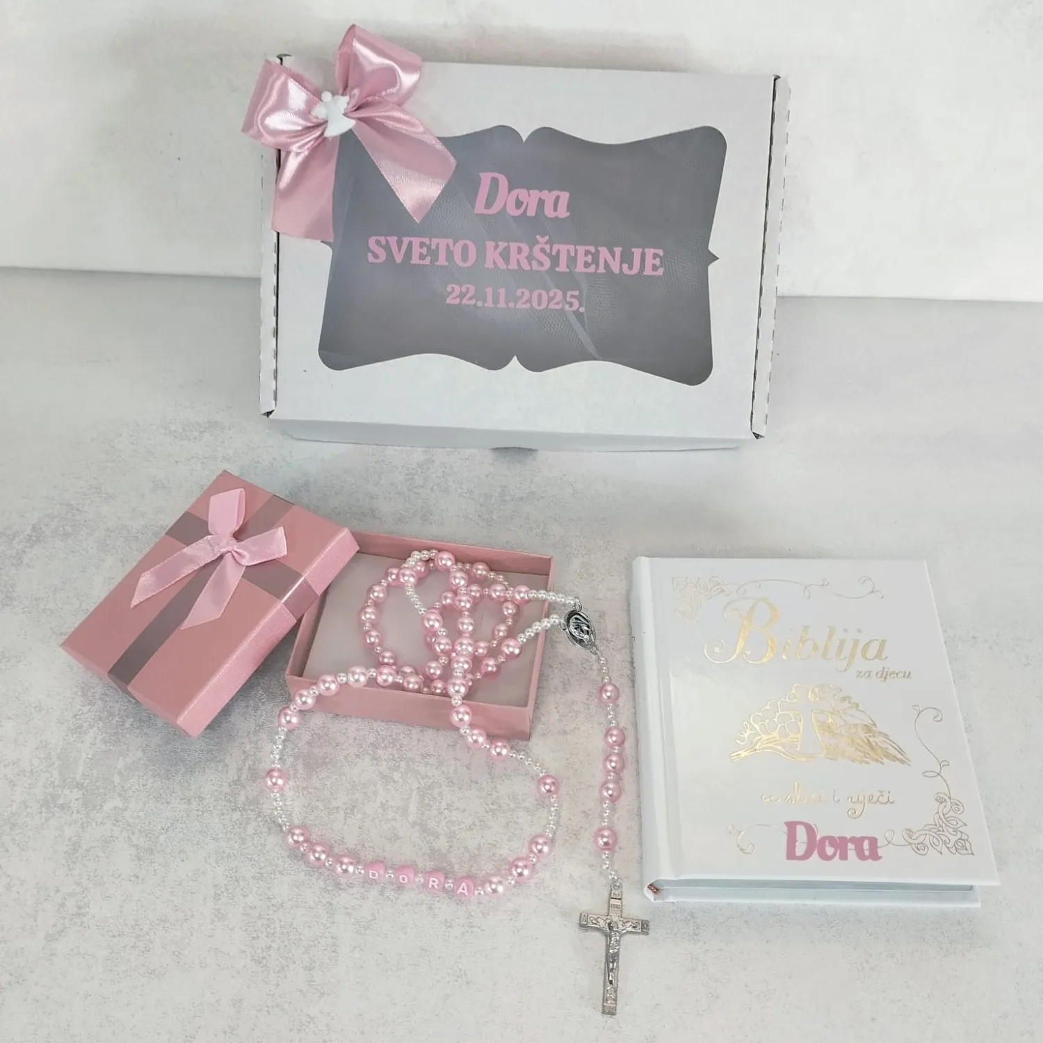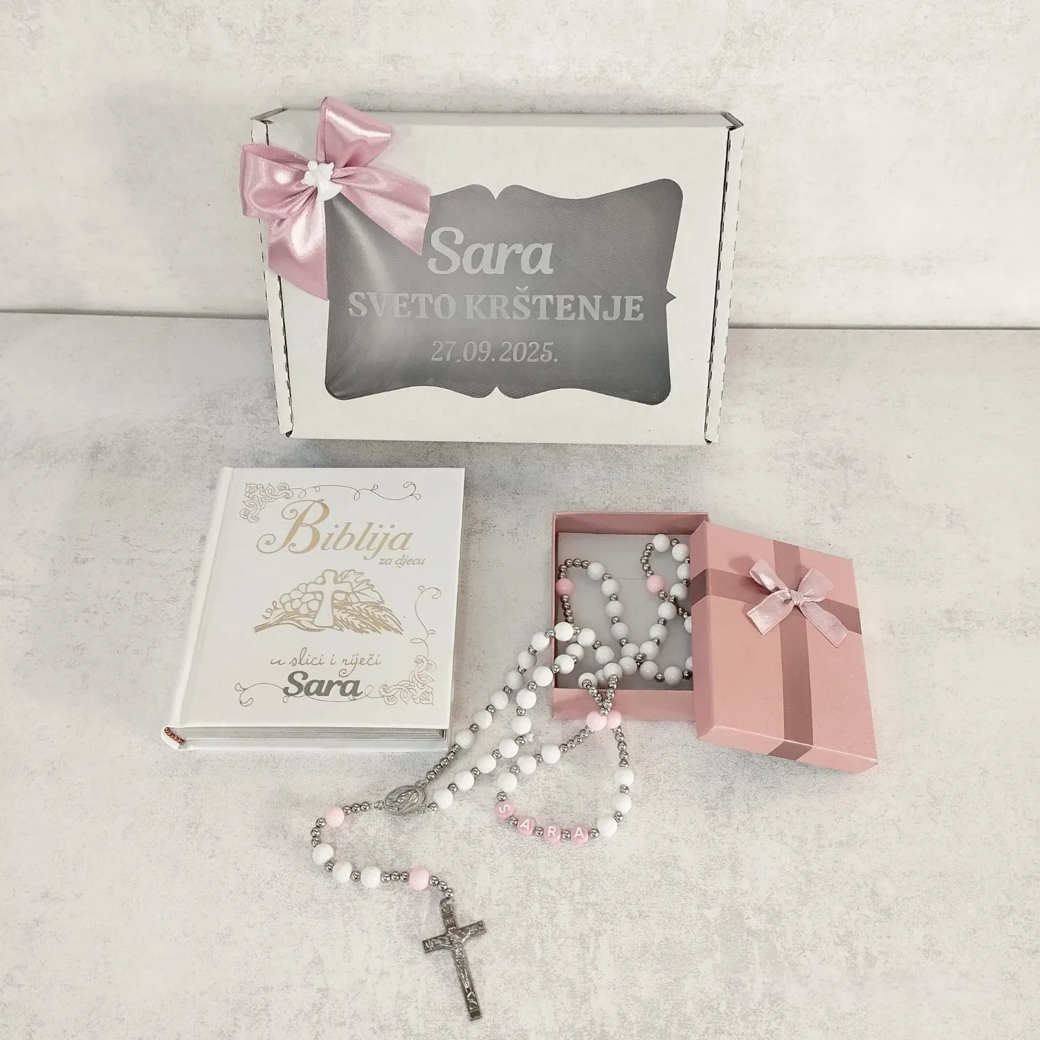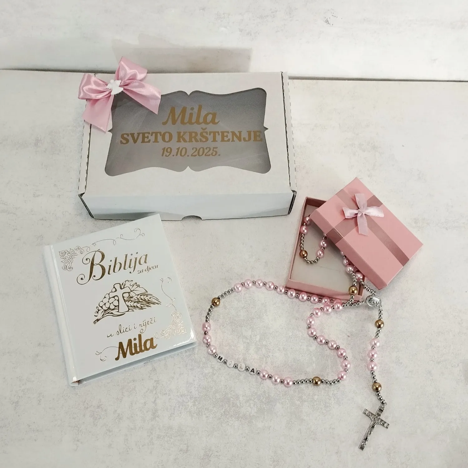 Prekrasno ilustrirana Biblija za djecu s brojnim pričama iz Staroga i Novoga zavjeta i krunica sa imenom kao simbol vjere, ljubavi i pažnje.