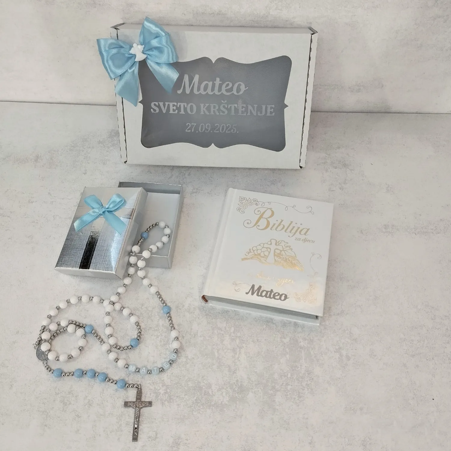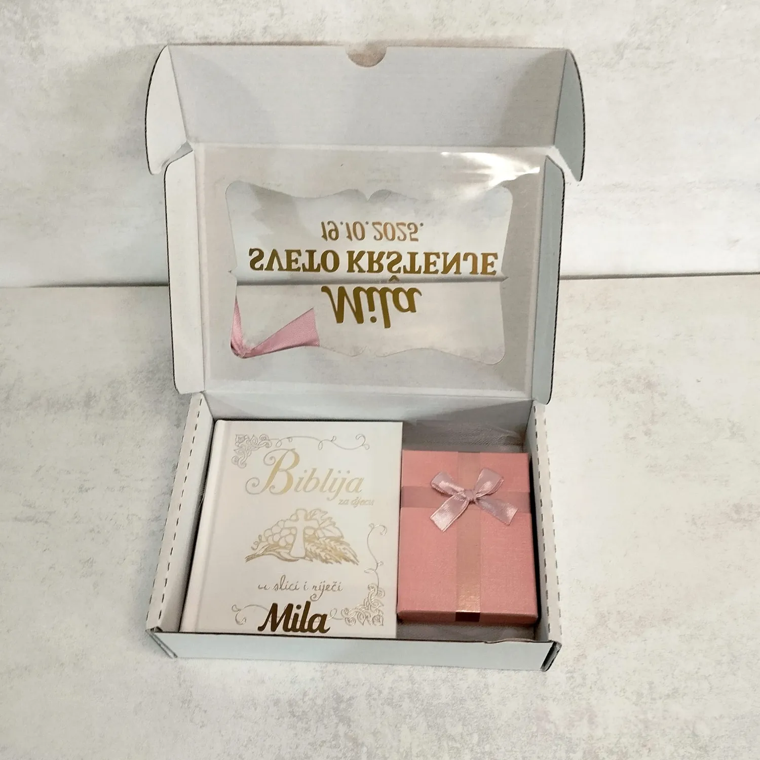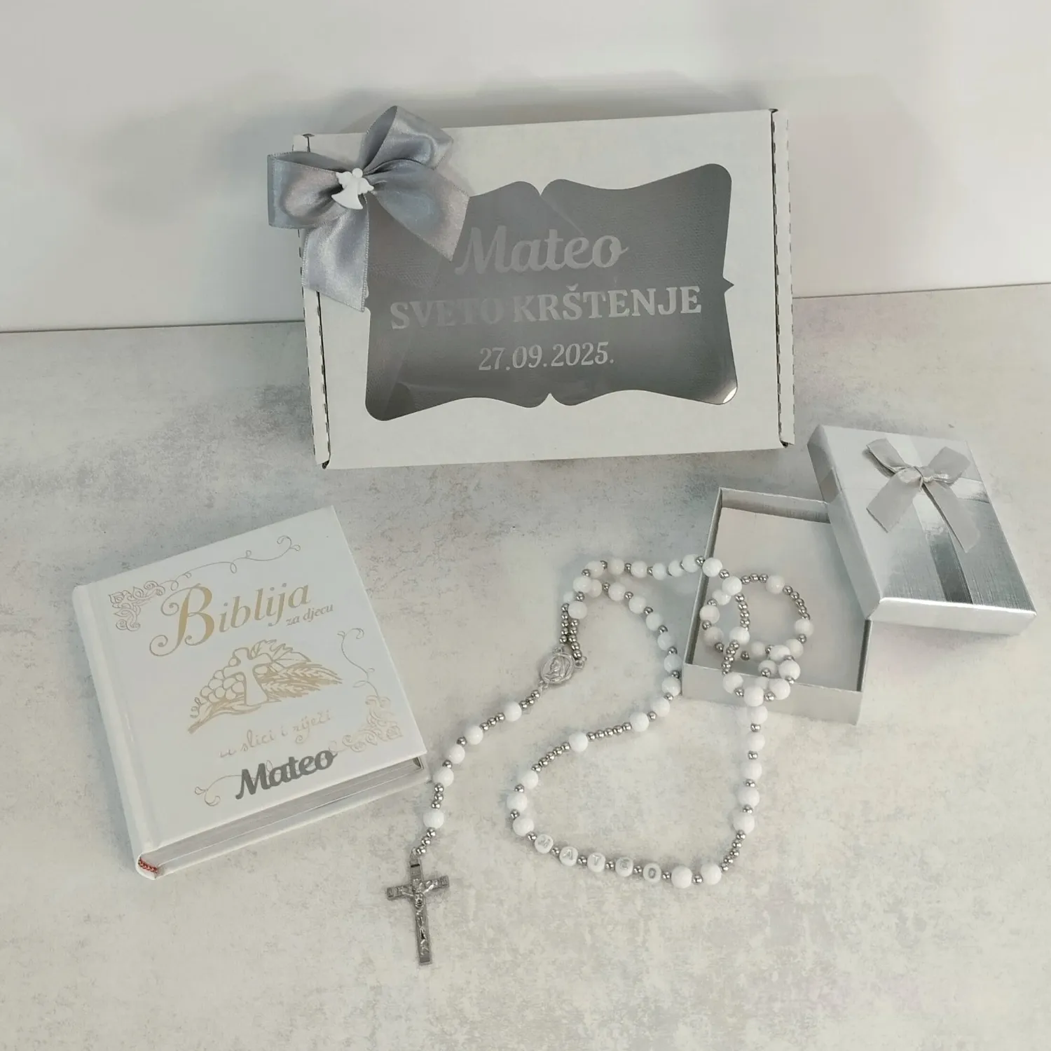 Prekrasno ilustrirana Biblija za djecu s brojnim pričama iz Staroga i Novoga zavjeta i krunica sa imenom kao simbol vjere, ljubavi i pažnje.