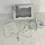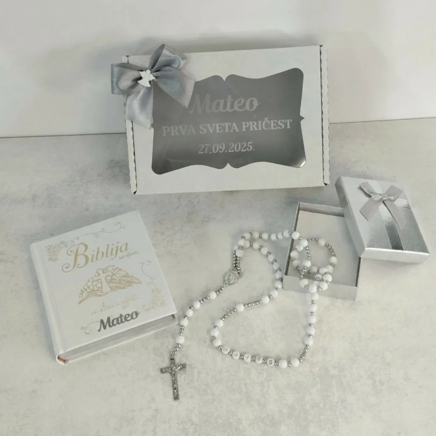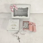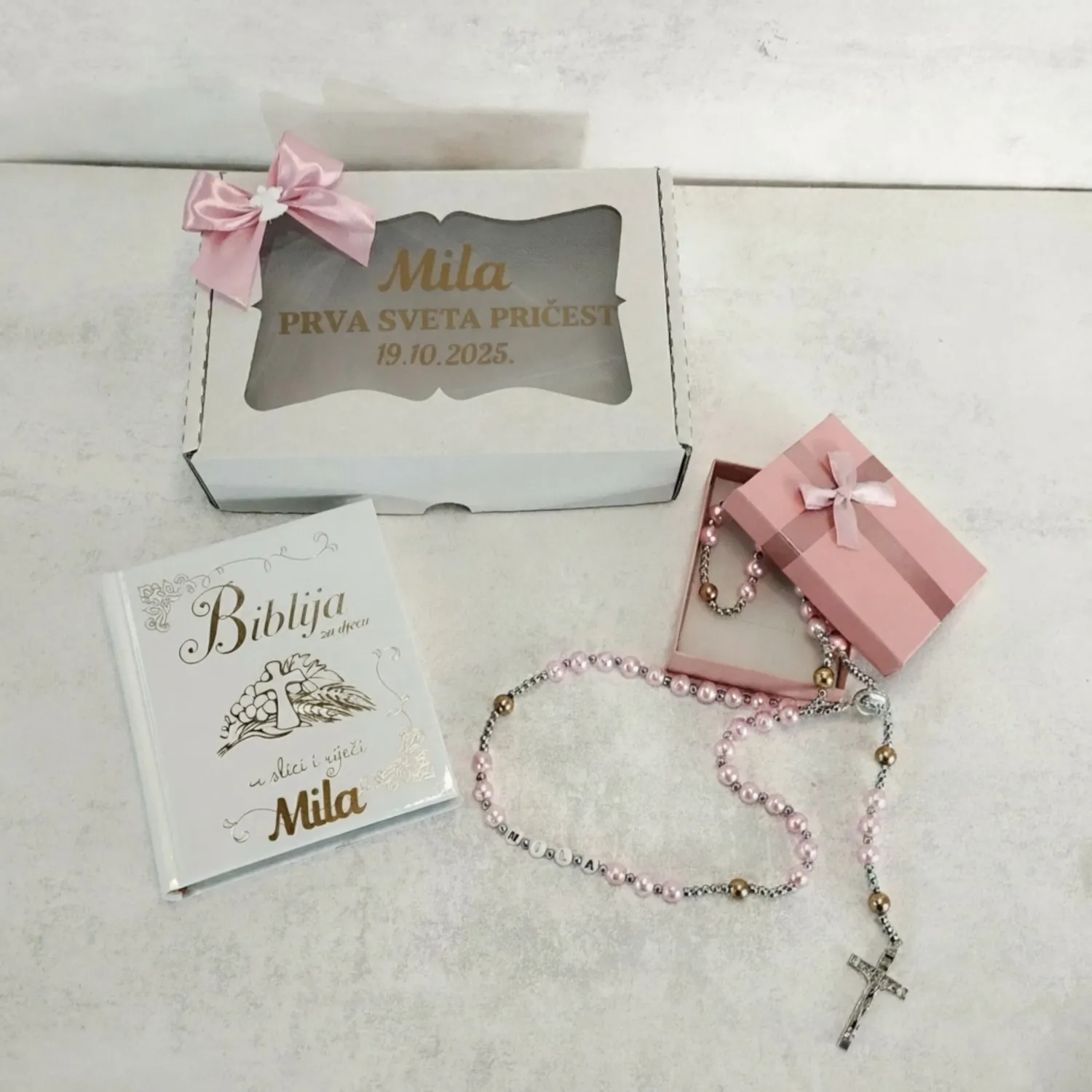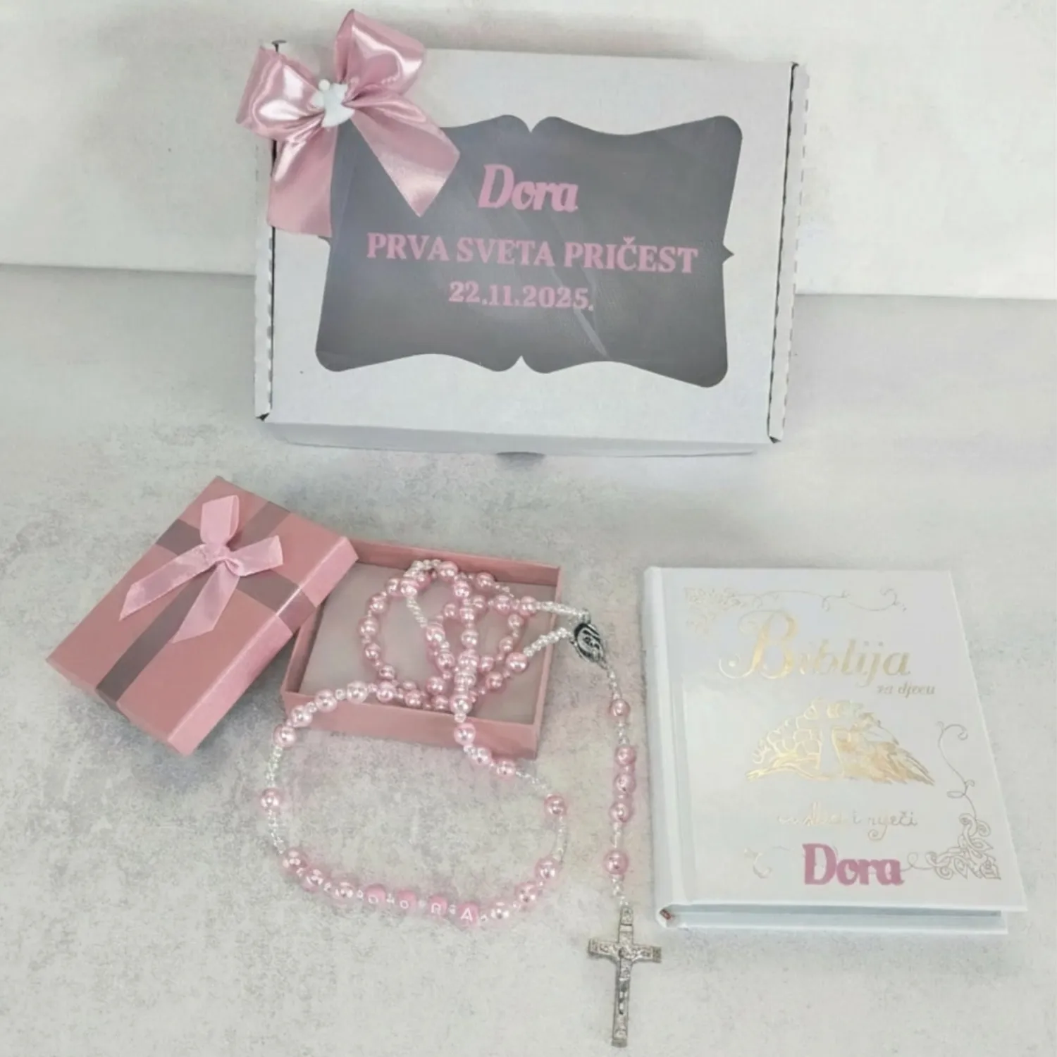 Poklonite najljepšu uspomenu za prvu svetu pričest s ovom predivnom ilustriranom Biblijom za djecu i krunicu s imenom.