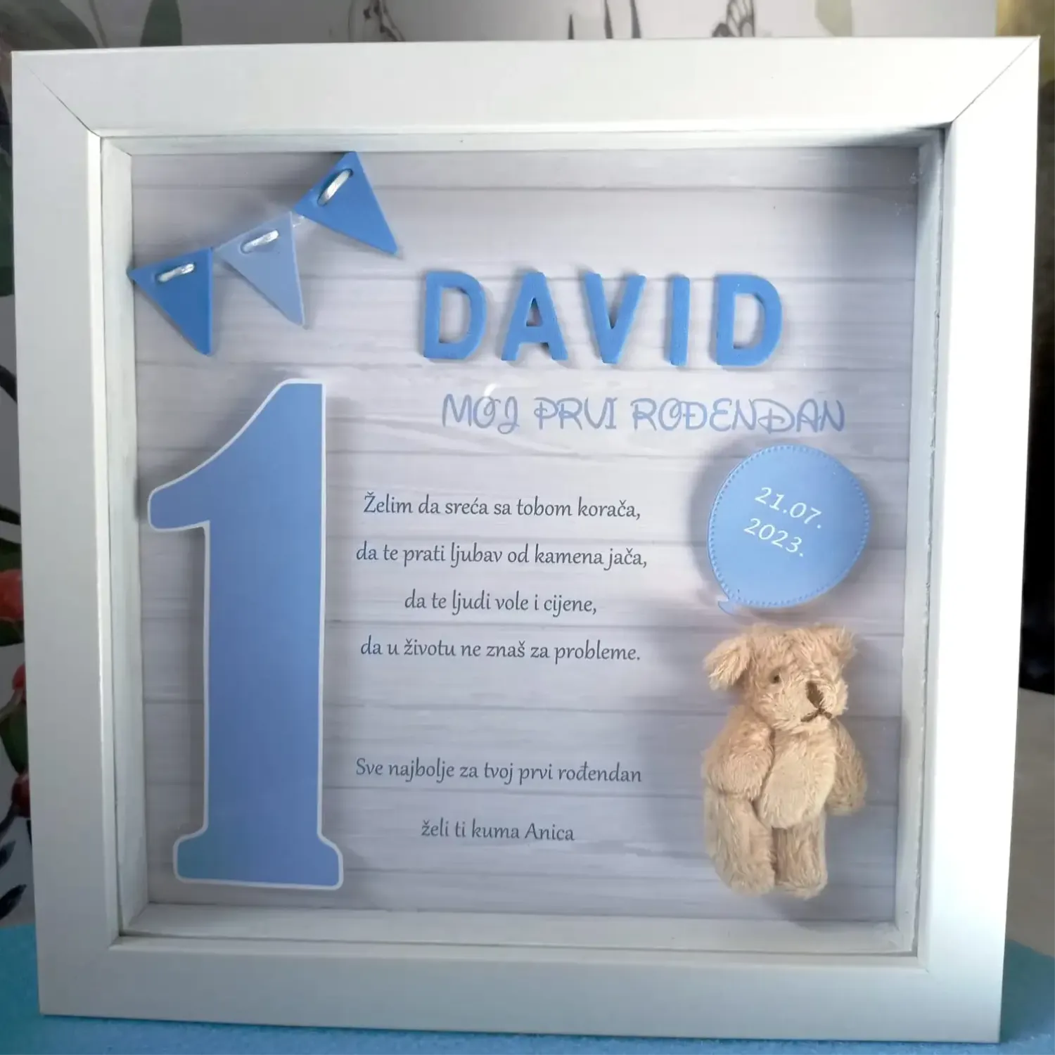 Poklonite prekrasni personalizirani duboki okvir kao uspomenu na prvi rođendan. Savršen poklon koji će postati prelijepa uspomena.