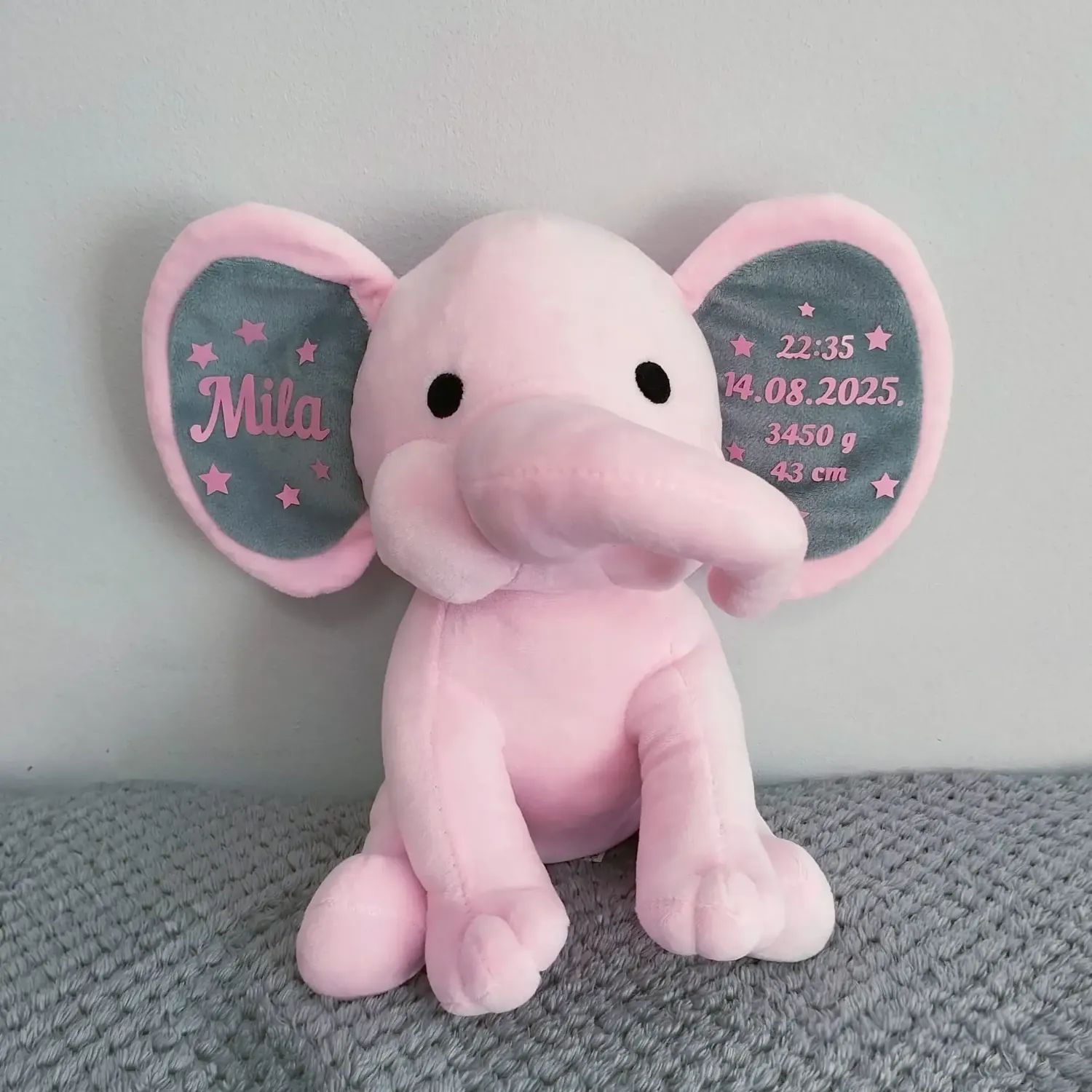 Za prve bebine trenutke poklonite mekanog prijatelja, ovog nježnog slonića koji nosi ime, datum i sat rođenja, težinu i visinu bebe, pretvarajući ga u trajnu uspomenu i savršen poklon za novorođenče.