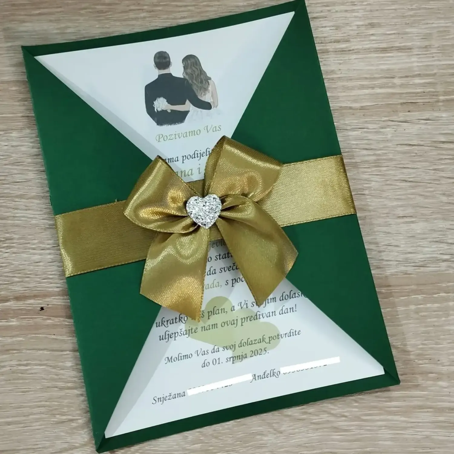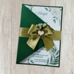 Učinite nezaboravan prvi dojam s  predivnim ručno izrađenim pozivnicama u elegantnoj zeleno-zlatnoj boji sa elegantnom vrpcom, mašnom i cvjetićima koji daju posebnu notu elegancije.