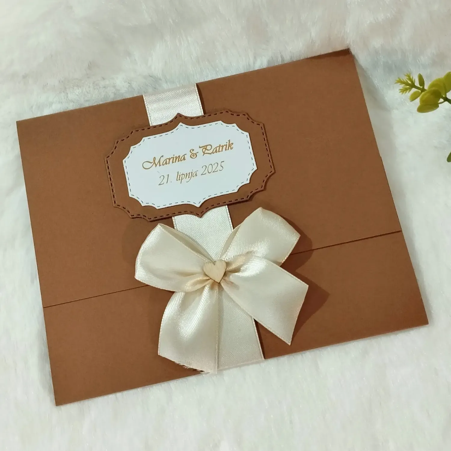 Učinite nezaboravan prvi dojam s predivnim ručno izrađenim pozivnicama u svijetlosmeđoj boji u kombinaciji bež vrpce i mašne koje daju savršenu kombinaciju i sklad boja.