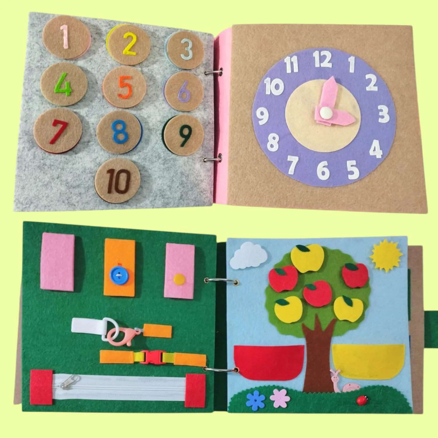 Ova edukativna tiha knjiga osmišljena je kao edukativni materijal koji potiče razvoj fine motorike, pažnje, koordinacije i prepoznavanja boja i oblika.