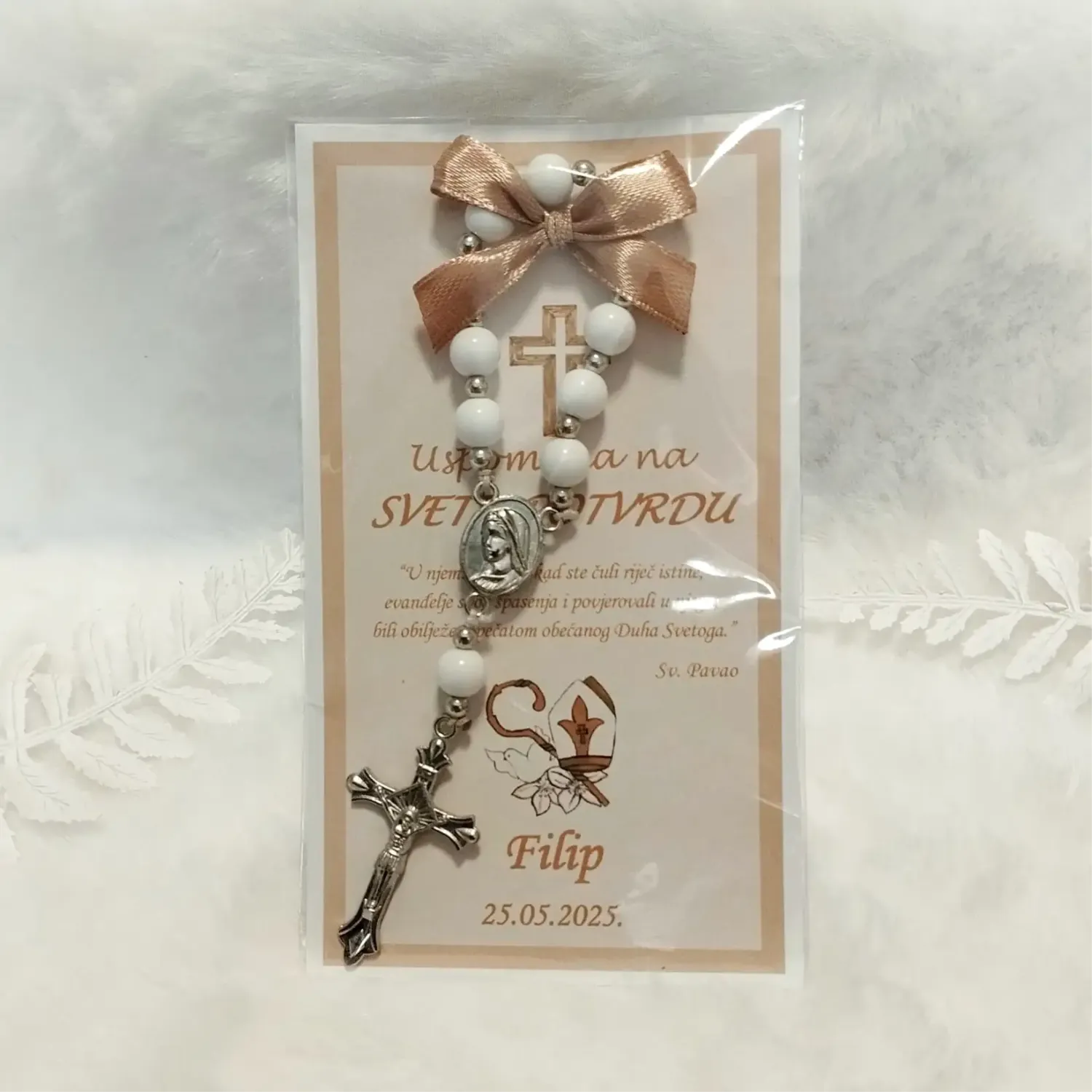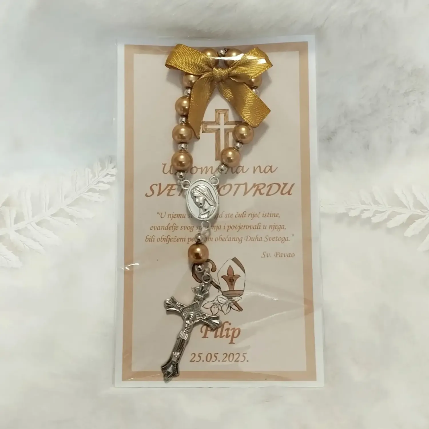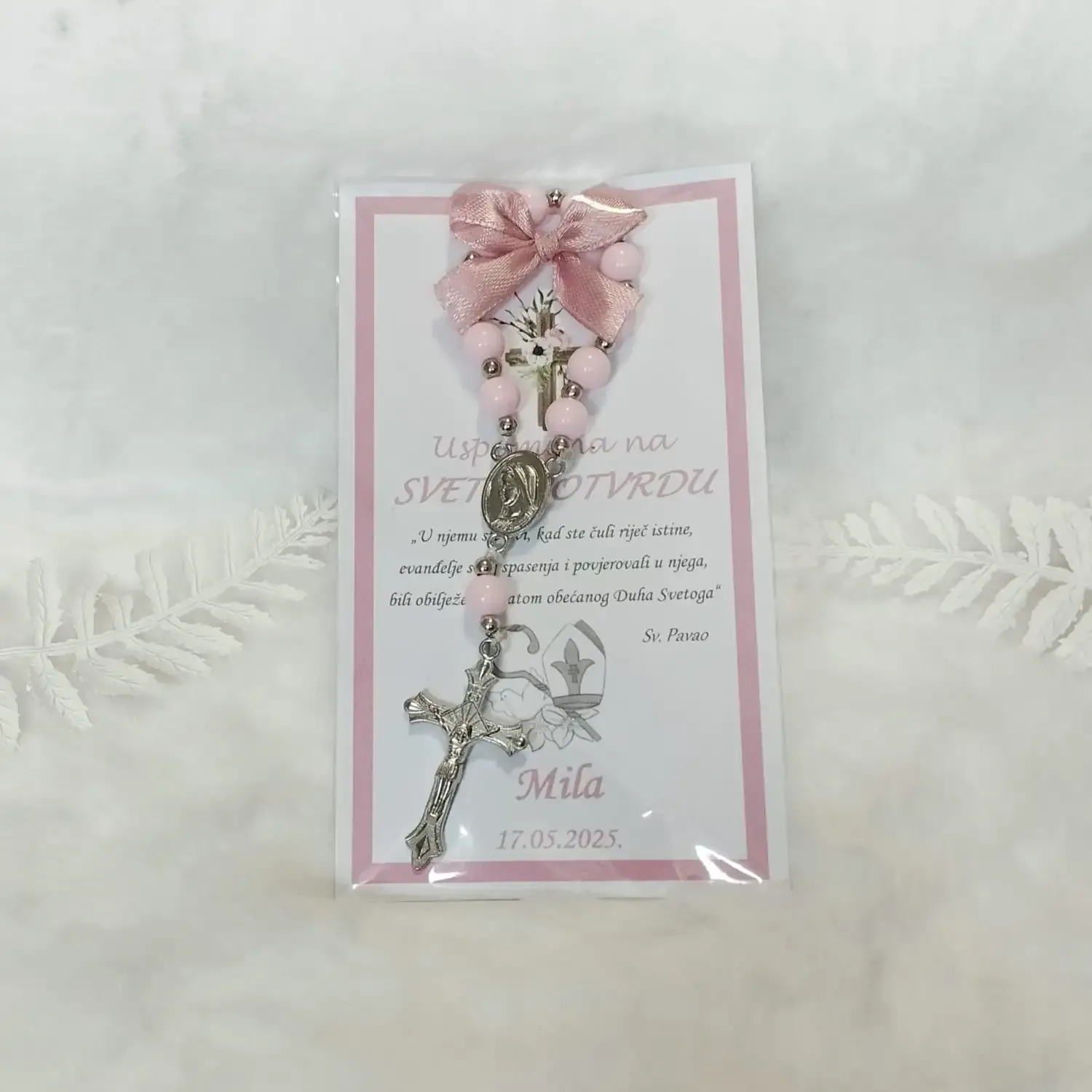 Elegantne zahvalnice s malom krunicom i prigodnim detaljima, savršena kao zahvala i uspomena na poseban dan.
